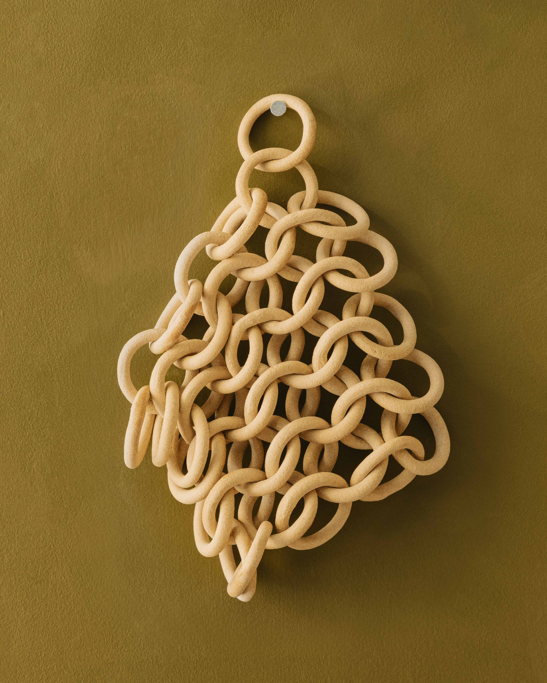 Chainmail panel, grogged tan clay with tonal variations and single metallic inclusion.